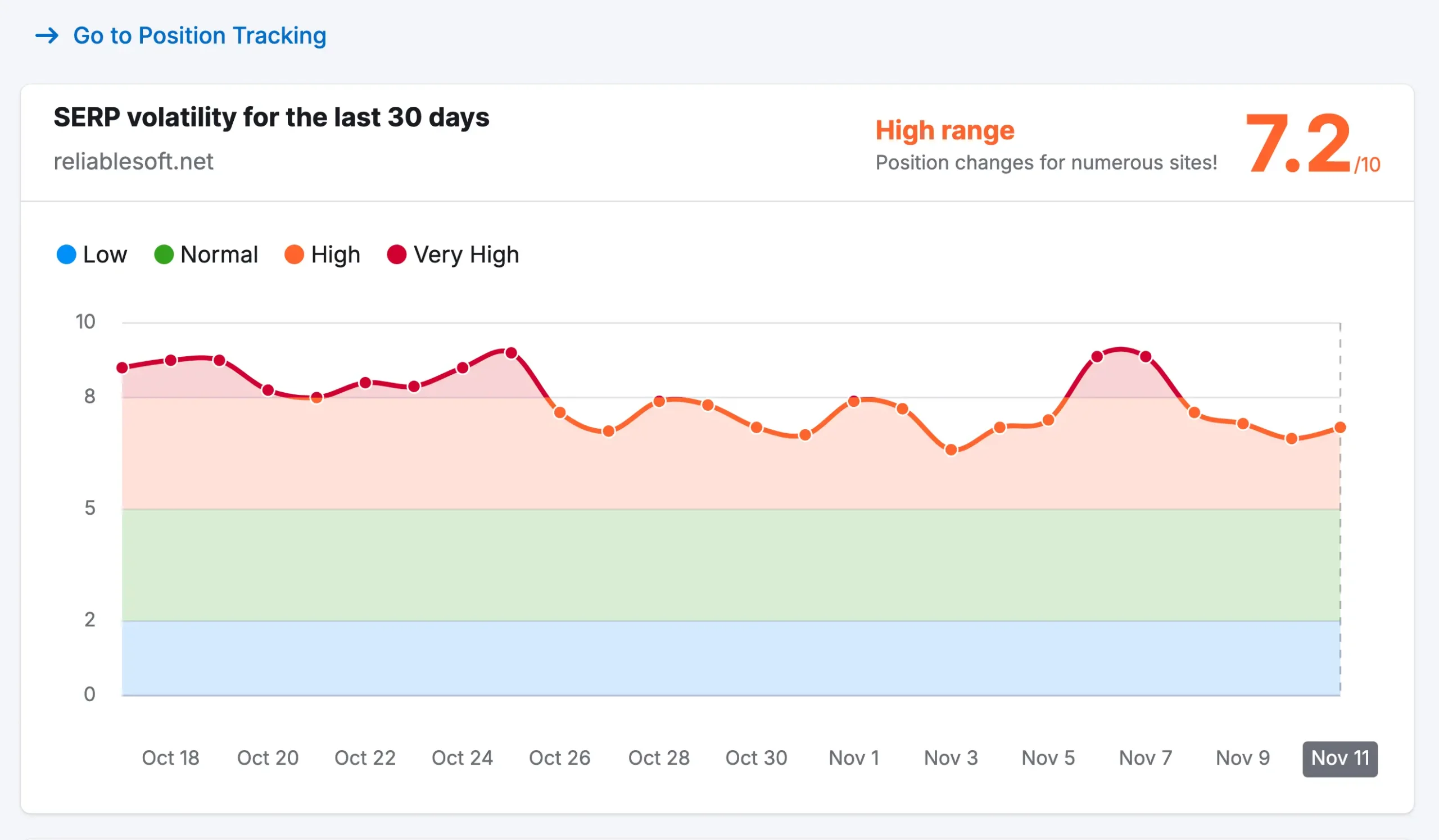 Semrush has a popular sensor tool that shows Google SERP volatility over the last 30 days. A not-so-well-known feature of Semrush is that you can view your personal score and see how your website is affected by changes in Google SERPS.