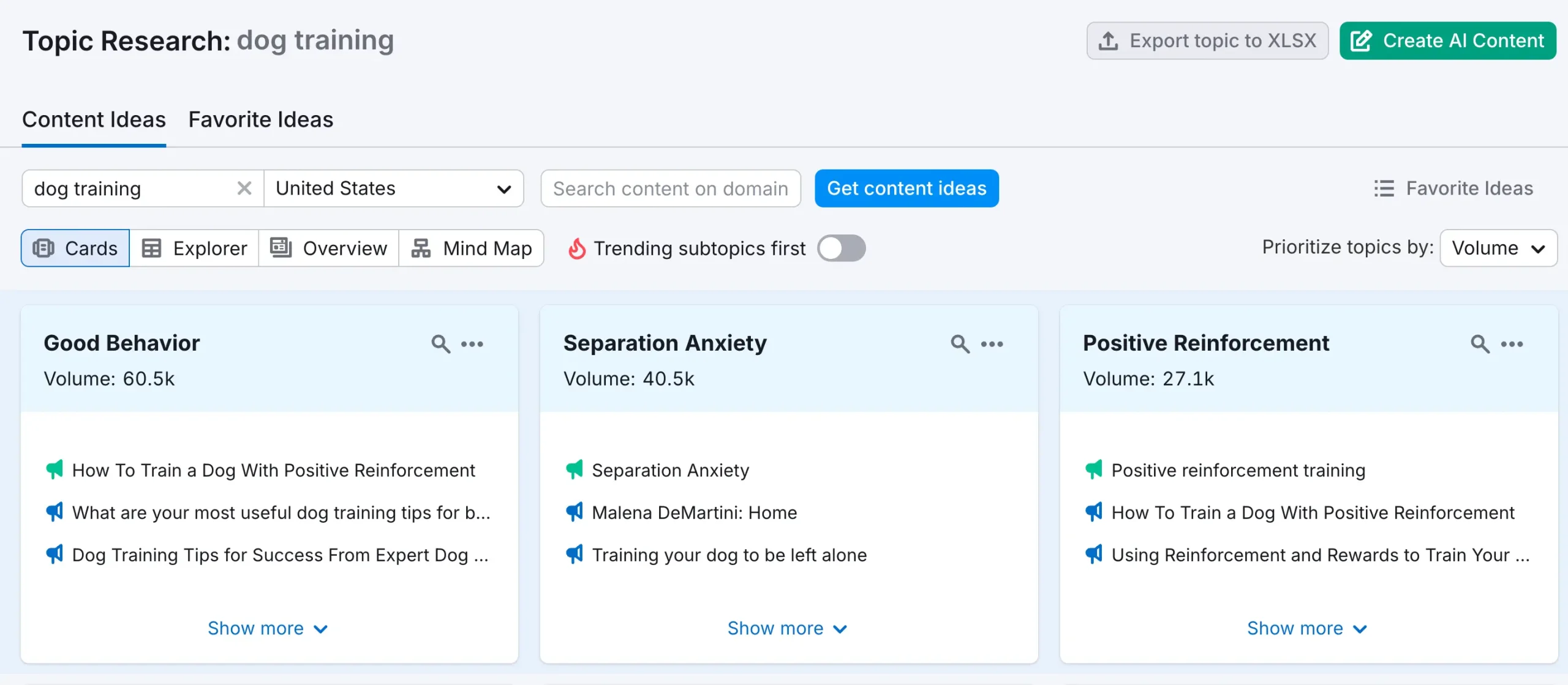 By entering a topic, you get details of all related keywords grouped by relevancy. You can see popular headlines, trending subtopics, user questions, and anything else you need to analyze a topic in detail.