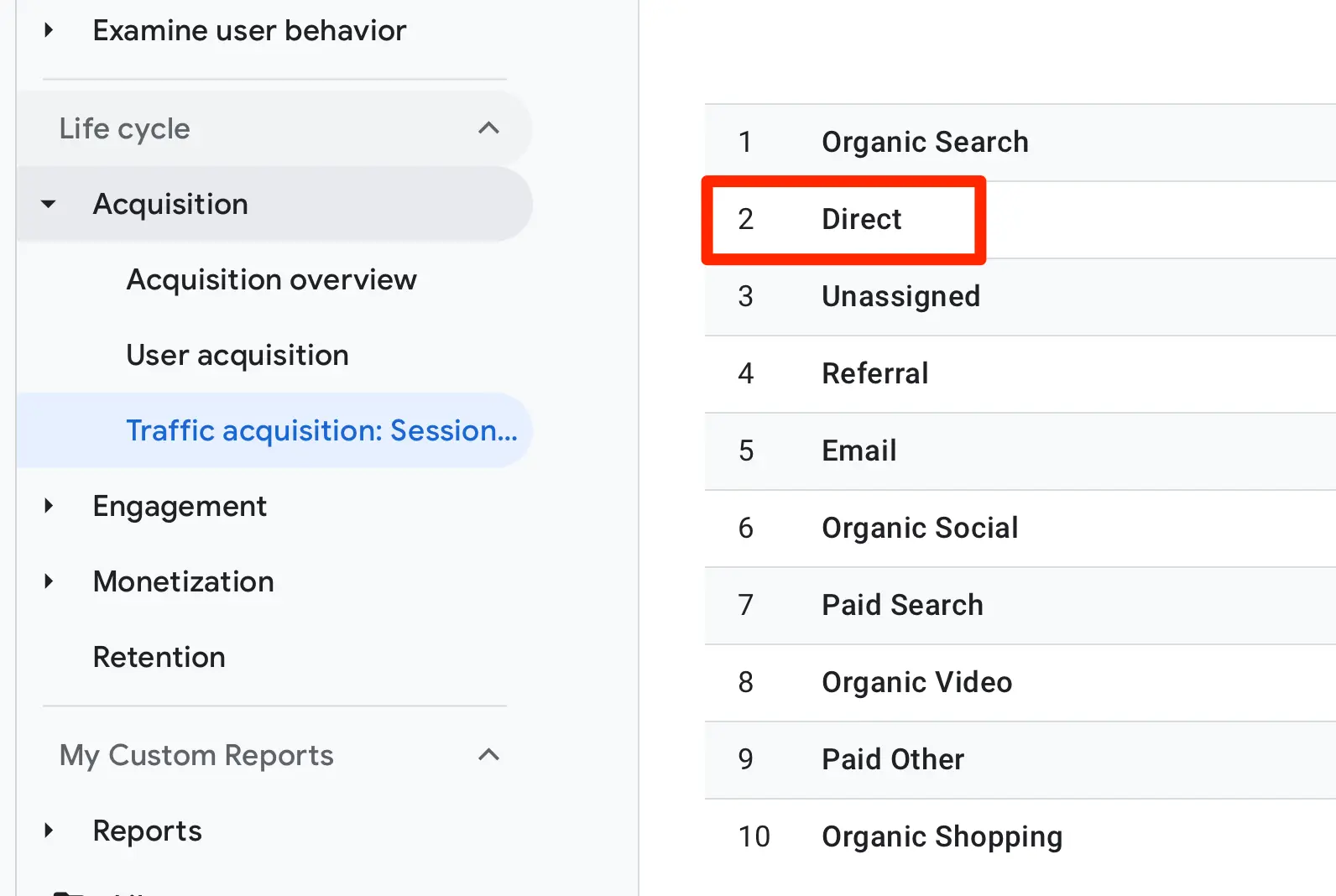 To view your direct traffic, go to Google Analytics and click on the Traffic Acquisition Report (under Acquisition).