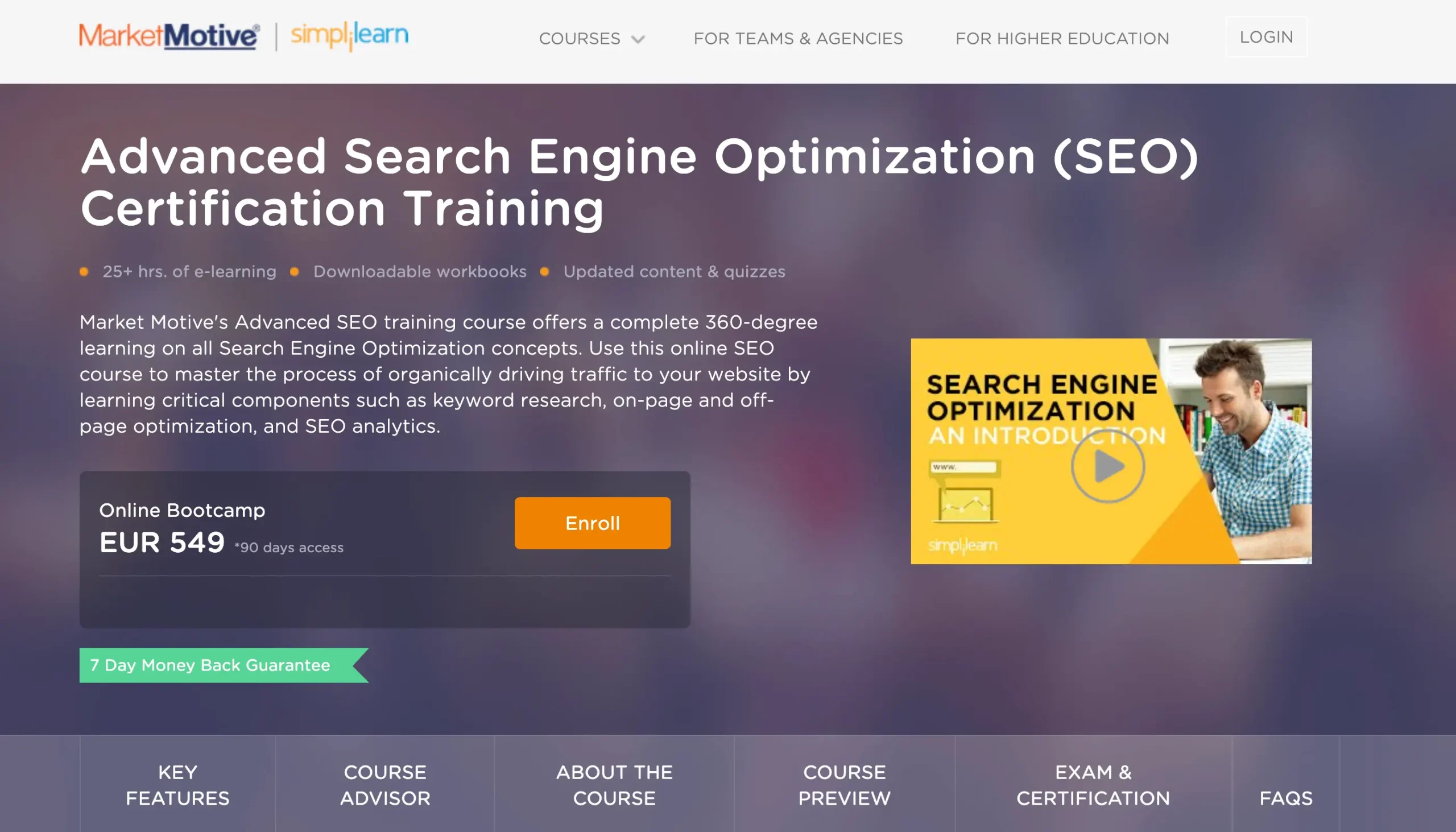 The Search Engine Optimization (SEO) course is delivered by SimpliLearn, one of the big players in online training. They offer many certifications that you can take online (self-paced Learning), combine with a virtual online classroom, or customize for corporate training.