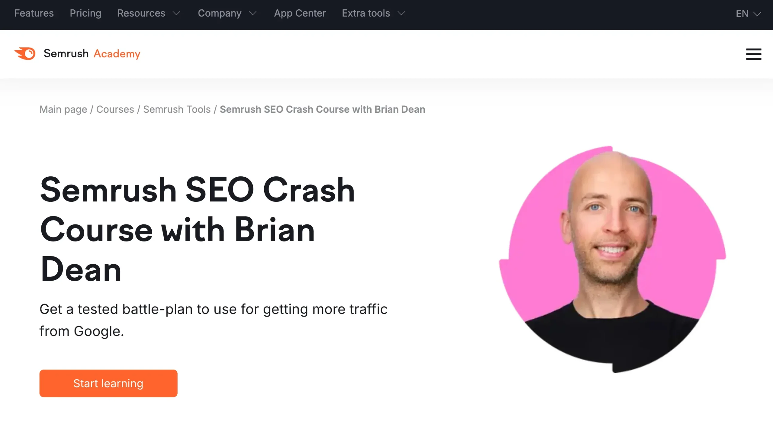 The Semrush SEO Crash Course with Brian Dean is a free, actionable course designed to teach the fundamentals of SEO. Across six lessons, you'll learn essential topics like keyword research, content creation, link building, and SEO monitoring.