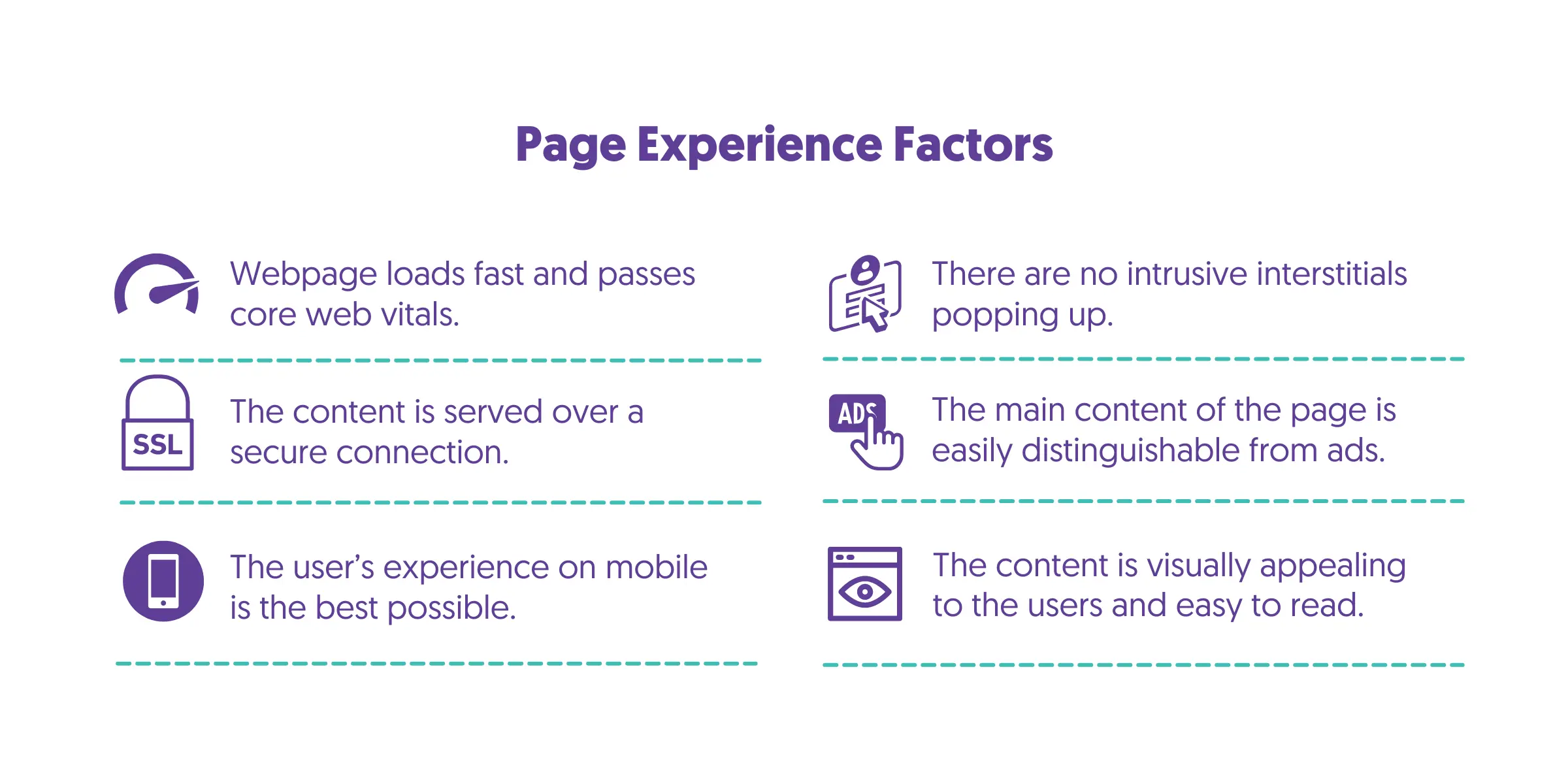 Page experience looks for the things we already discussed (like speed and core web vitals) but also for elements that distract users from accessing the page's main content, like full-screen popups.