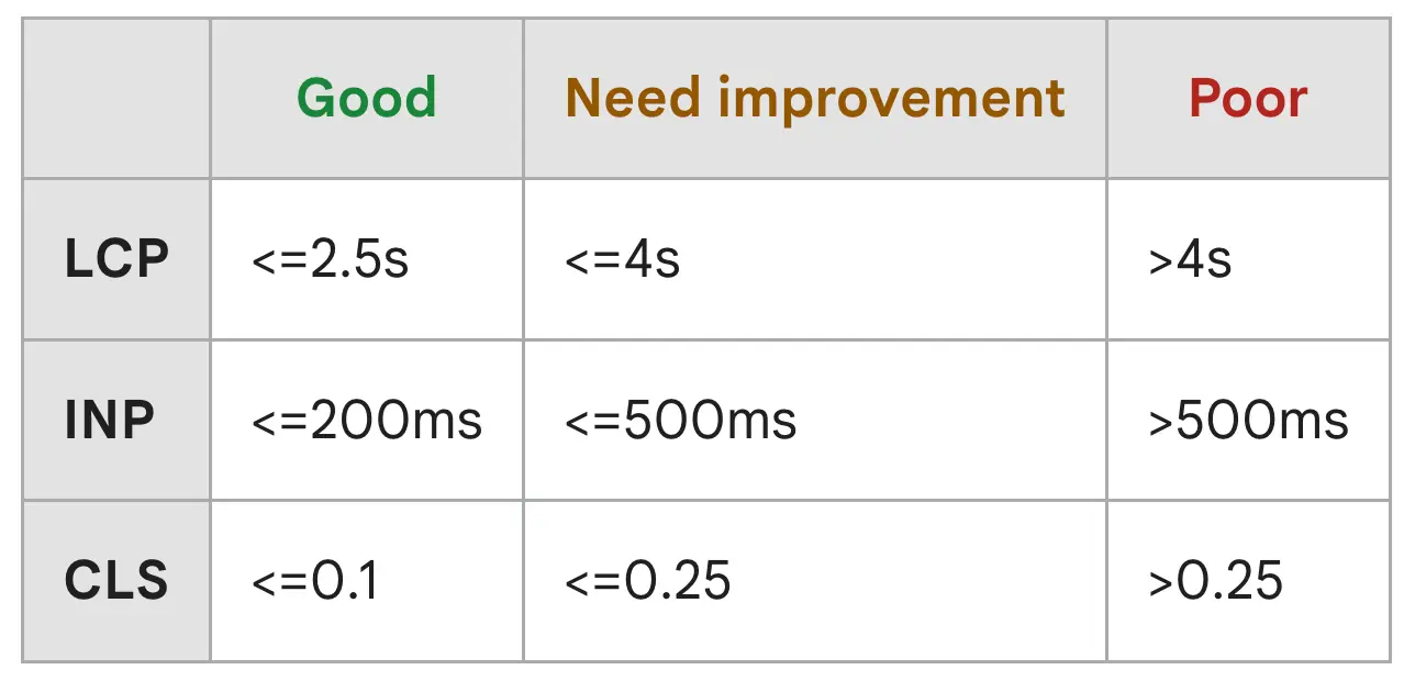 - INP (Interaction to Next Paint) measures the time it takes for your website to respond to user interactions. The ideal value is less or equal to 200 milliseconds.