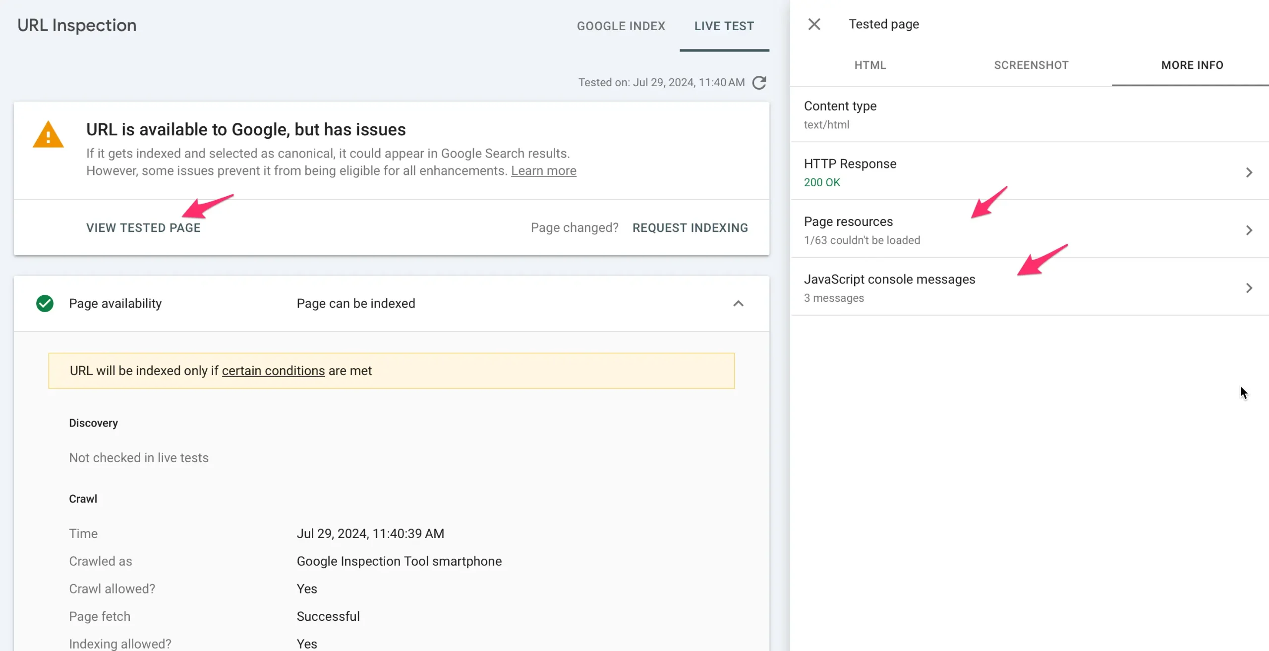 - Review the results under “More Info” to see if there are any issues. Look specifically for resources that are labeled as blocked or not loaded. If you find blocked resources, check your robots.txt file to see if they are being unintentionally blocked. Update it to allow Google to access these resources.