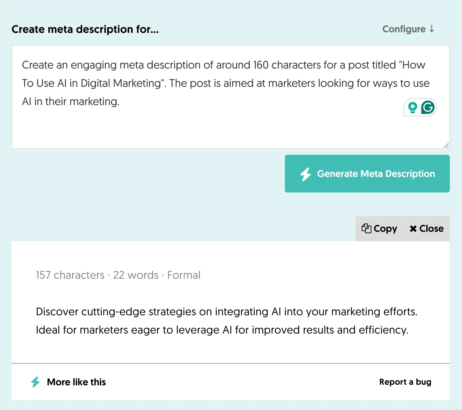 You can safely use AI text generator tools to get ideas for writing engaging meta-descriptions. One example is our free AI meta description generator.
