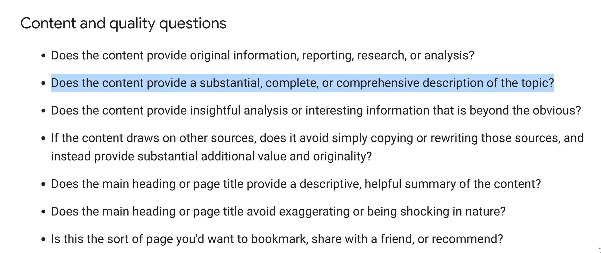 According to Google, one of the criteria for high-quality content is topic coverage. Their guidelines explicitly state that the content should provide a substantial, complete, and comprehensive description of the topic.