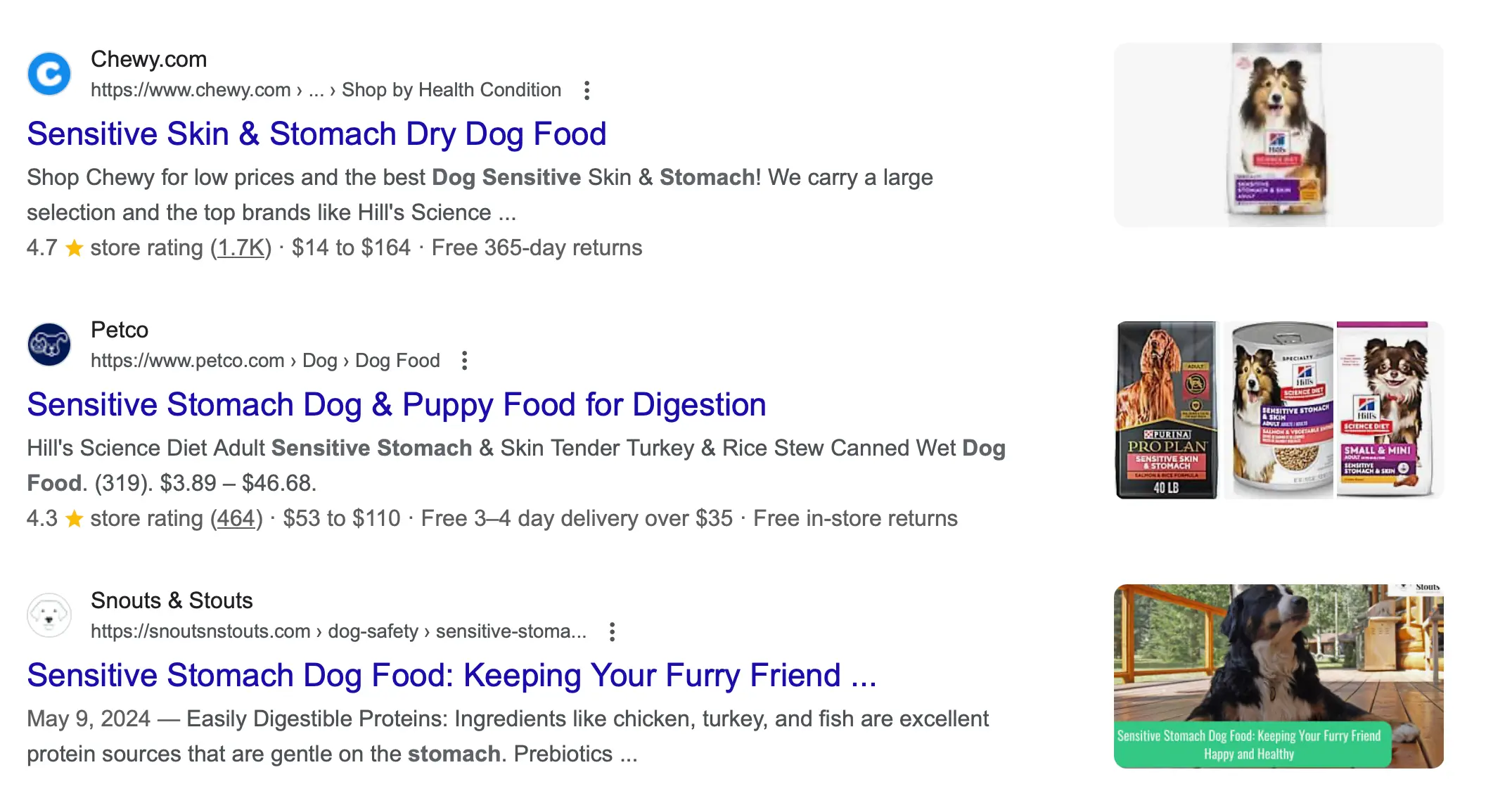 For example, when you search for "dog food for sensitive stomach", you'll notice that the top results are product and category pages from eCommerce websites. If you want to rank for this term, you must have the same type of content.