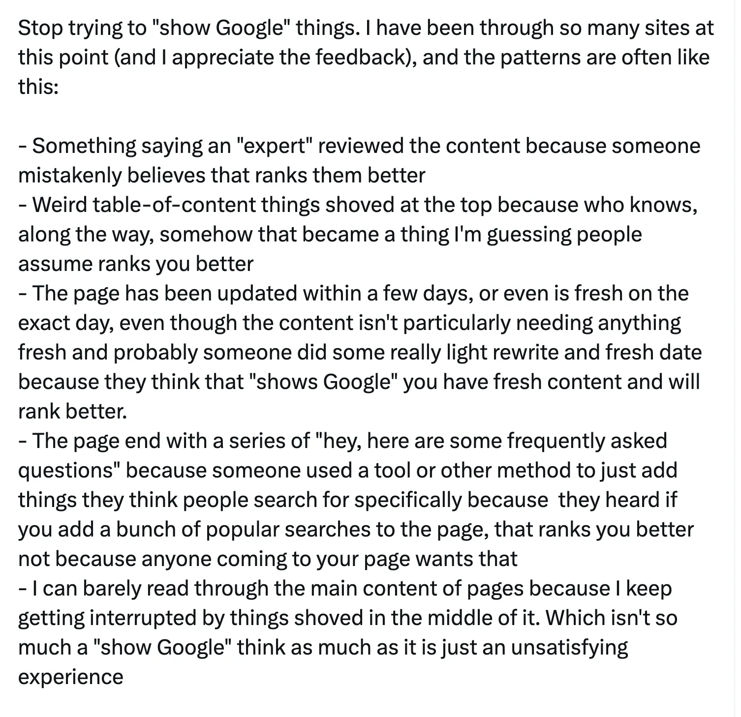 The key takeaway from this post is that you shouldn't over-optimize your website for Google. Instead, you should build a website that serves a particular purpose and follows practices contributing to a positive user experience.