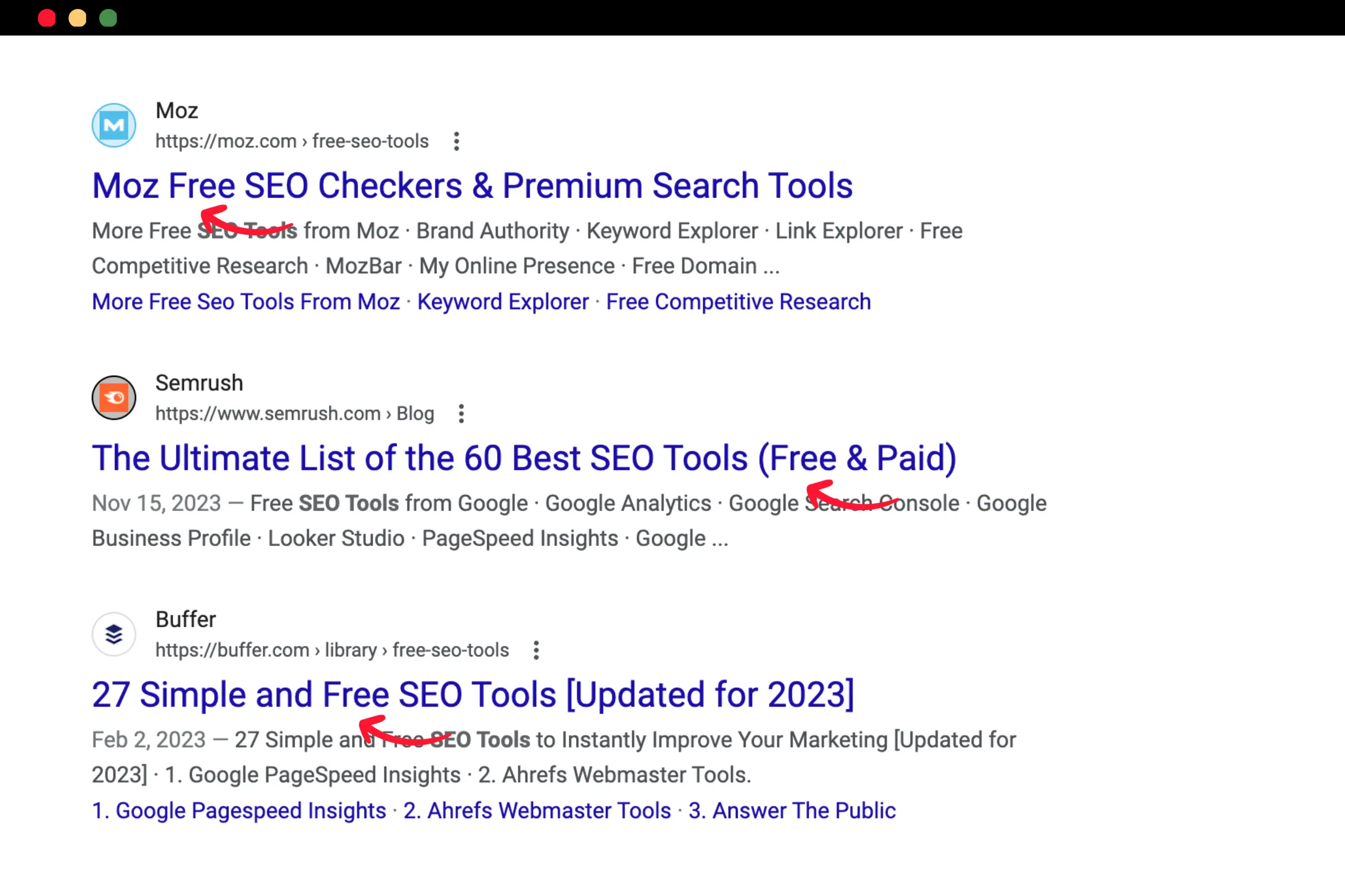 Another example. If you are writing an article about ‘SEO tools,’ you will notice that almost all results are about lists with ‘Free Tools.’