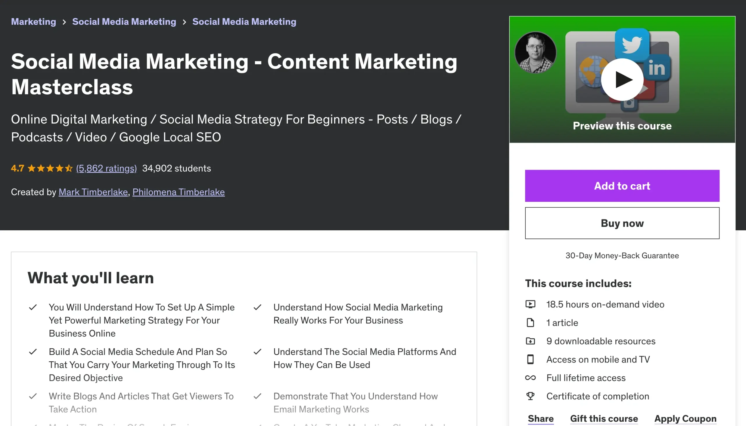| Social Media Marketing Masterclass By Udemy | $99.99 | 20 hours |