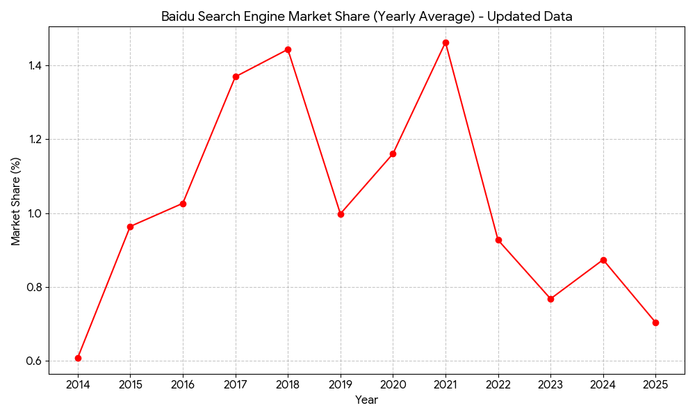 Baidu was founded in 2000 and is China's most popular search engine. Its market share is increasing steadily, and according to Wikipedia, Baidu serves billions of search queries per month. It is currently ranked 6 in the Wikipedia Website Rankings.