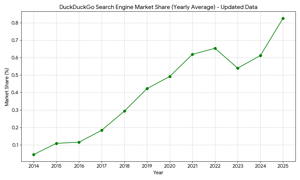 As shown below, DuckDuckGo's best year was 2022, with a 0.69% market share, but it has been dropping since then.