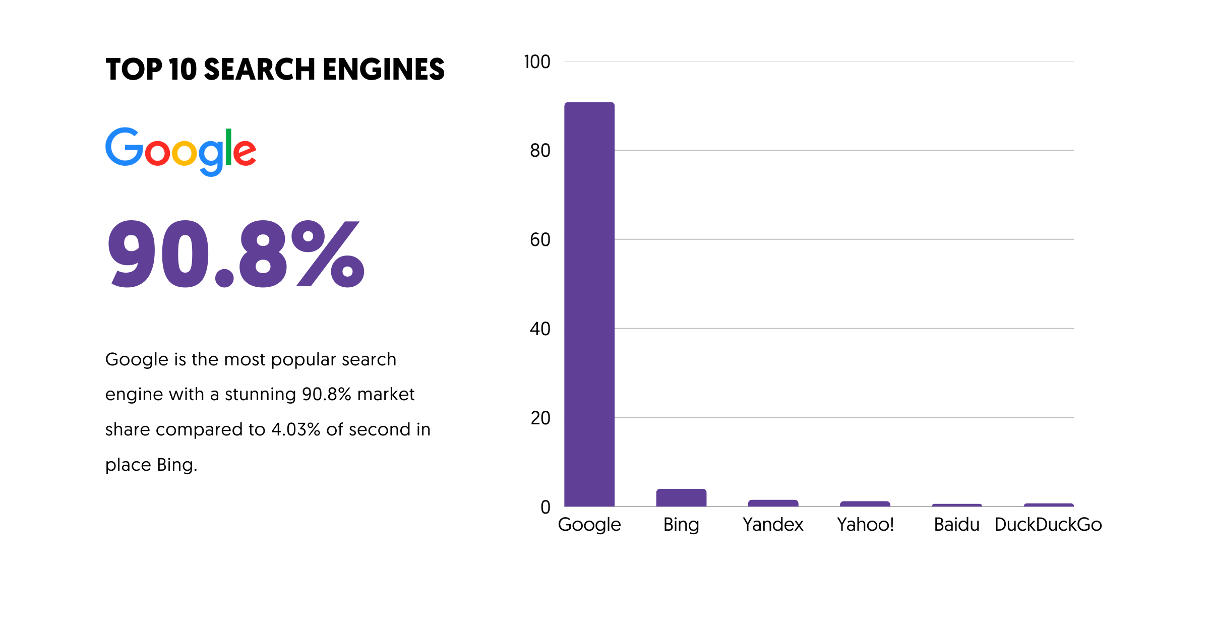 In fact, several alternative search engines want to take Google's throne, but none is ready (yet) to pose a threat. Google is the most popular search engine, with an amazing 90.8% market share compared to 4.03% of second-place Bing.