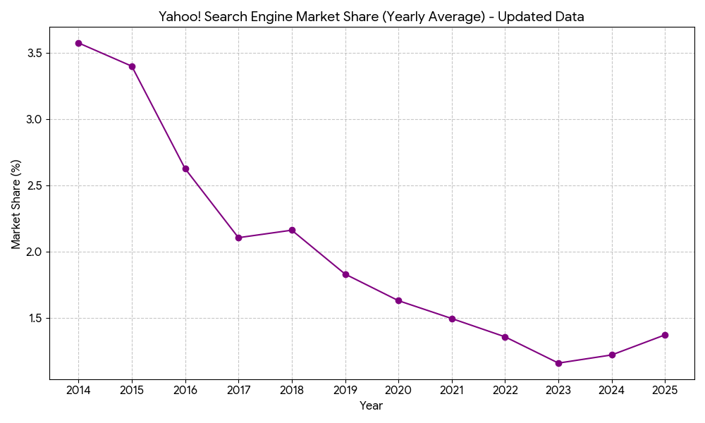 Yahoo's pick market share was in 2015 with 4.19%, but since then, it's steadily declining year by year.