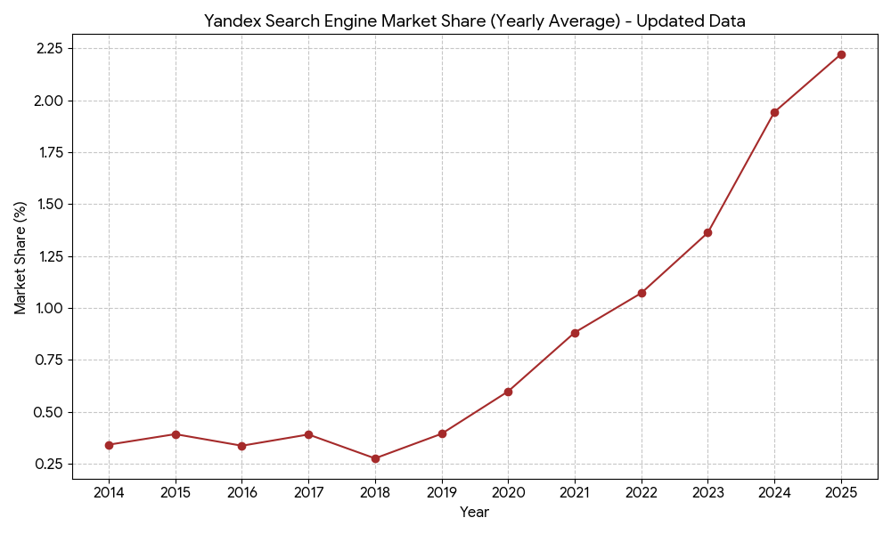 Yandex, Russia's most popular search engine, has a global market share of around 1.56%