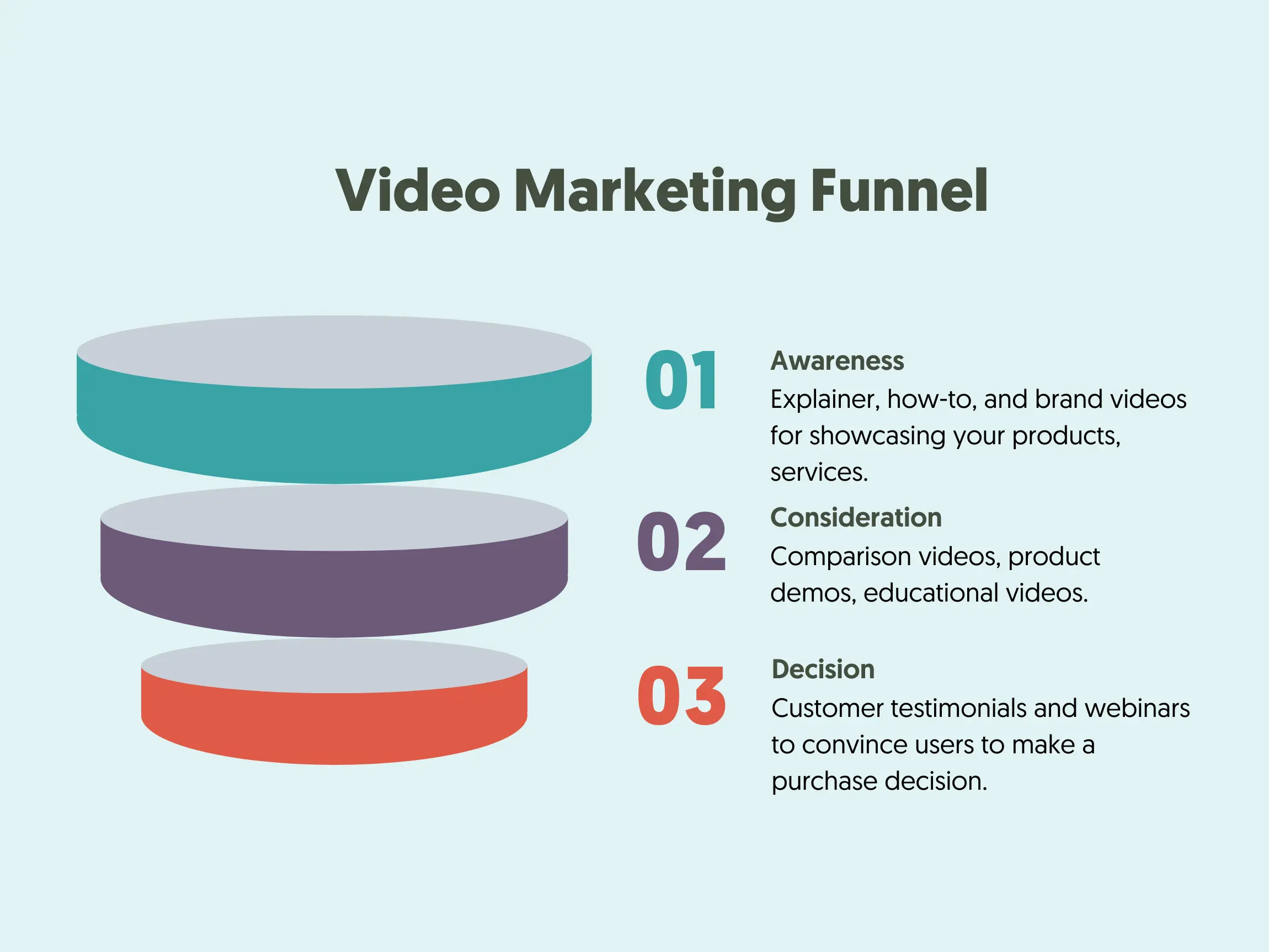 Consideration: To convince customers to purchase your products, you must offer unique insights. Comparison videos, product demos, and similar educational pieces can be extremely effective during consideration.