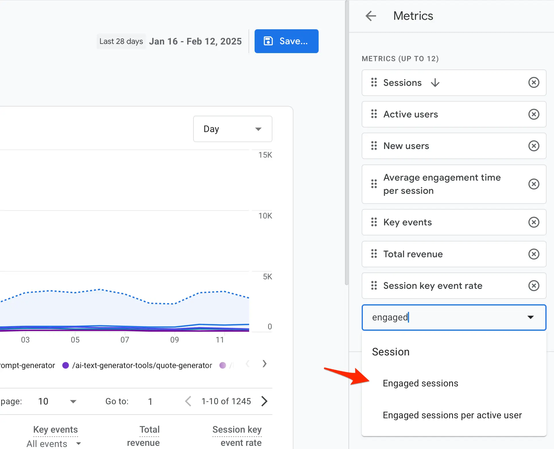 To add session metrics to any report, click the "Customize report" icon and search for the metrics.