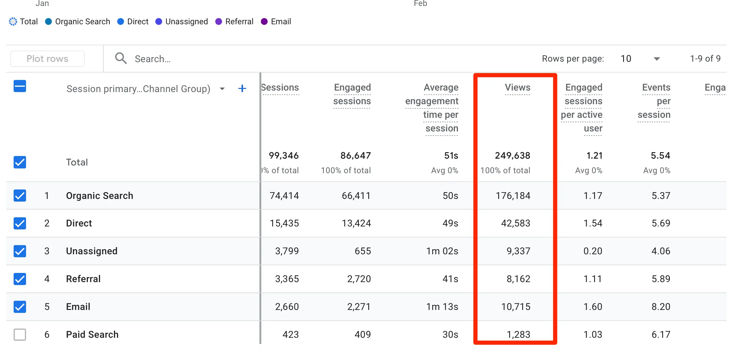 You’ll see "Sessions" listed as a key metric, along with traffic sources (e.g., organic search, social, paid search).