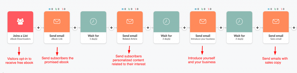 Here is an example of an email automation campaign that converts people who sign up to download a free resource (such as an ebook from your website).