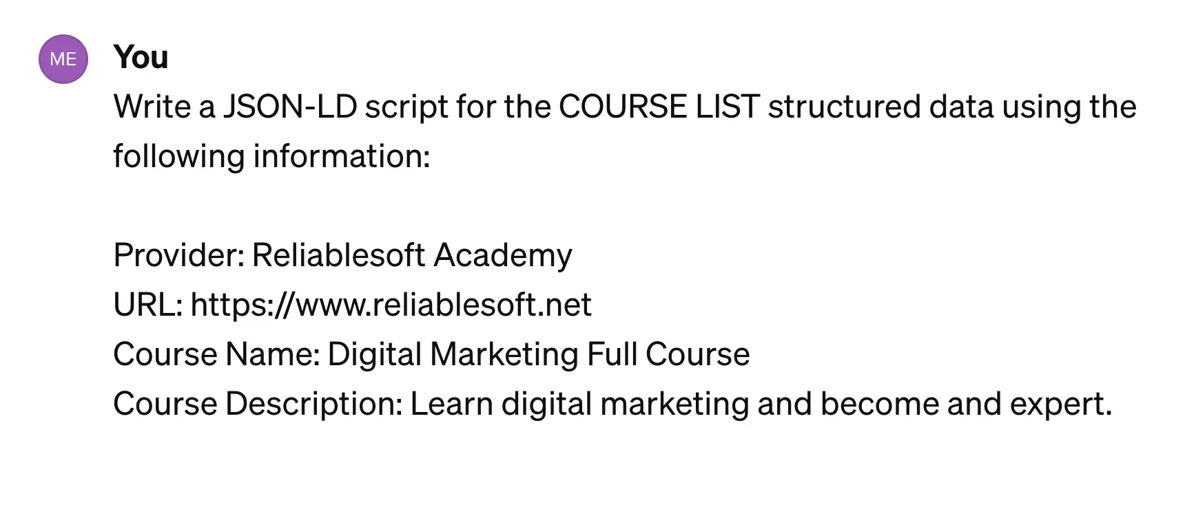 In the prompt, make sure that you specify the schema markup type and provide the tool with the required data. Here is an example of a prompt to use: