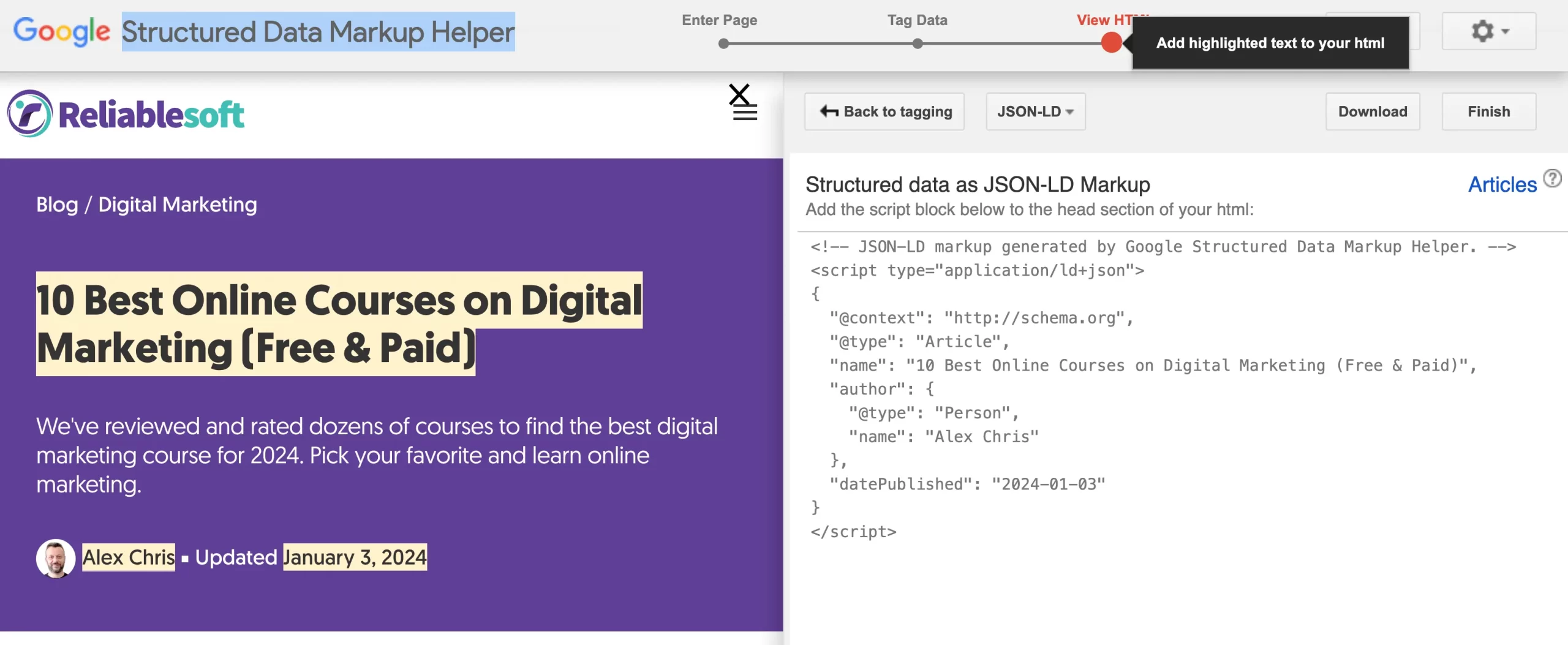 All you have to do now is to highlight areas of your website and assign them to tags. You can view and download the generated structured data code when you are done.